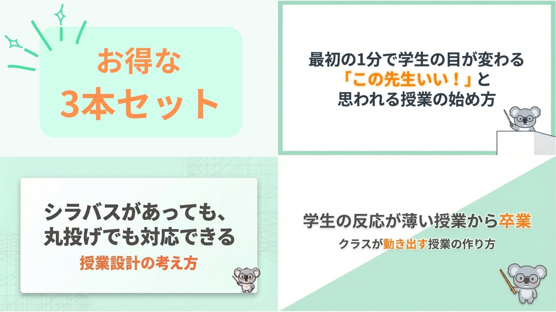 \リリース記念/ 通常16,500円 → 13,200円【動画】学生の反応が変わる授業づくり 完全スタート3本セット